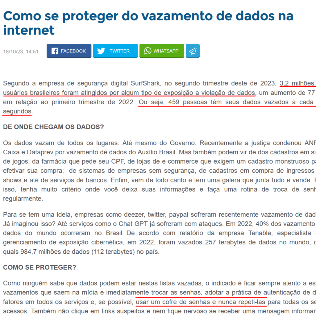 VEJA EXEMPLOS DE QUATRO NOTÍCIAS REAIS SOBRE VAZAMENTOS DE DADOS. POR ISSO É TÃO IMPORTANTE CUIDAR DAS SUAS SENHAS